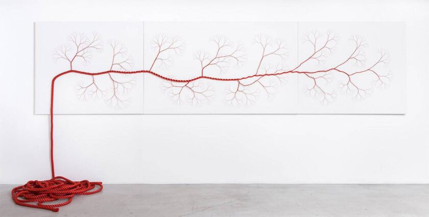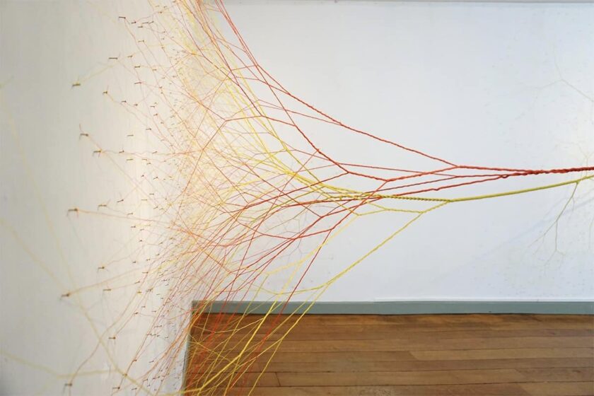 Corde colorate si propagano nello spazio come tentacoli, si snodano e si diramano in intricate architetture, creando un’infinità di biforcazioni e percorsi.