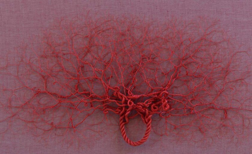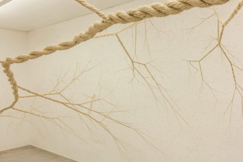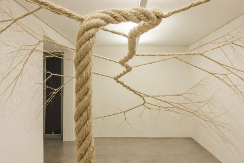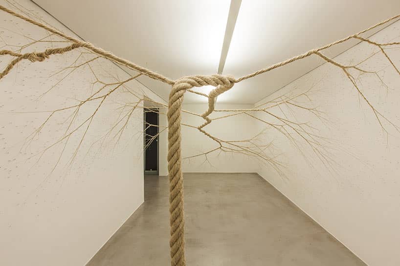 The rope used is an object of the everyday world, only transformed by the action of undo and redo-unroll, divide and twist-and the time spent in this process is imprinted on the organic body of Ciclotramas.