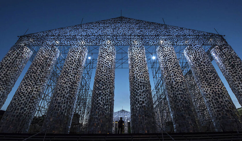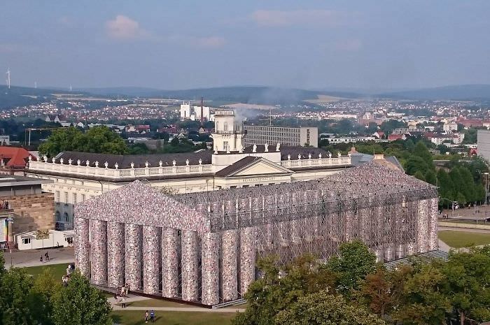 Una replica del famoso tempio greco rivestito da 100.000 libri selezionati, in collaborazione con l’università di Kassel, su 170 titoli storicamente banditi dalle varie istituzioni.