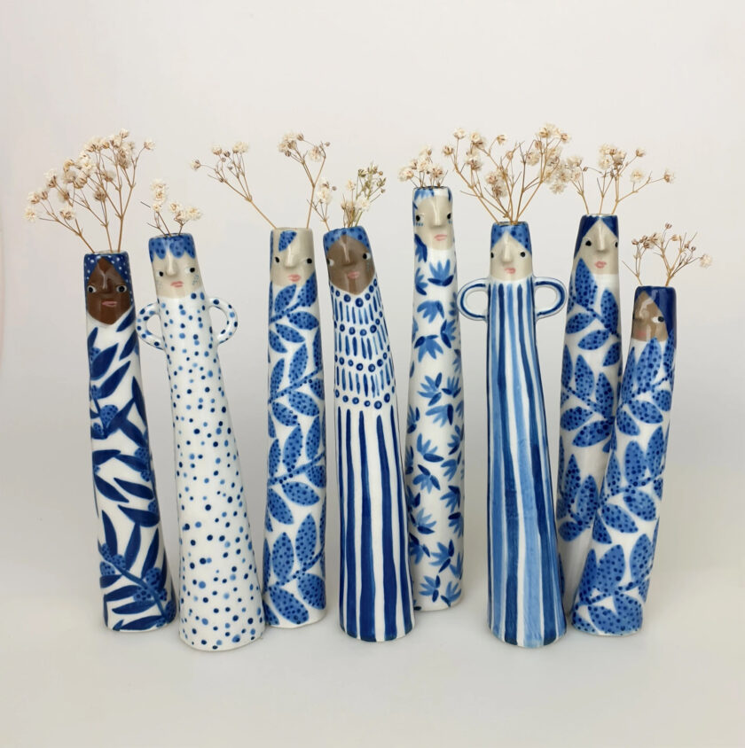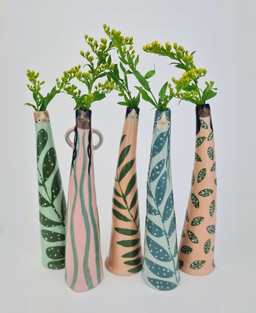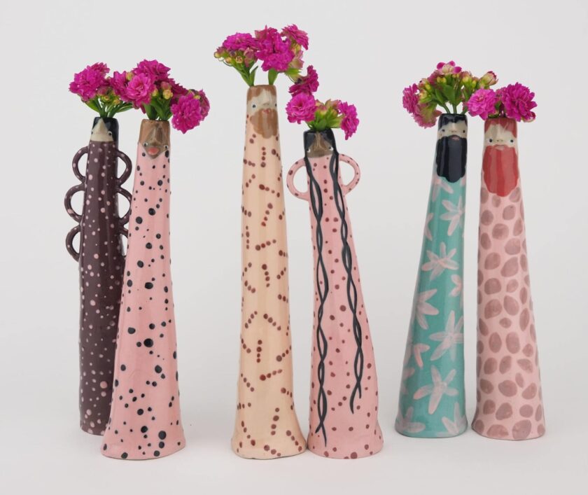 Dalle forme generalmente allungate e sagomati per contenere un unico stelo di fiore, i vasi prendono le forme di simpatici umani dalle espressioni buffe. Tra brillanti corpi dai colori pastello, adornati di pois, geometrie e motivi floreali.