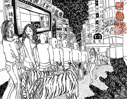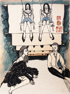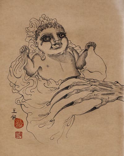 E’ uno spazio surreale quello della Wang, un luogo emozionale composto di fitte trame di segni e linee che impongono alla composizione del disegno un andamento come ondulatorio e sognante. Nei suoi disegni a china, il tratto, ora spezzettato ora a tramatura a spirale, invade e insinua ogni cosa in un delirio di tempi e di miti, dove tutto si confonde e s mescola e nel quale non esistono confini di stato e di culture.