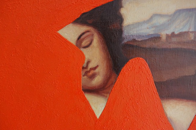 Dalla “bella pittura” di stampo classicista di Ingres, a quella accademica di Bouguereau, dalla Venere Dormiente di Giorgione all’ Amor Sacro e Amor Profano di Tiziano Vecellio, passando per le opere di Leonardo Da Vinci, Stieler e Velasquez, l’artista spagnolo Lino Lago demitizza con umorismo la sacralità di certi capolavori della storia dell’arte, che riproduce nei suoi quadri con tecnica virtuosistica, e ne ottenebra la sublime eleganza formale sovrapponendovi ampie colate di colore puro.
