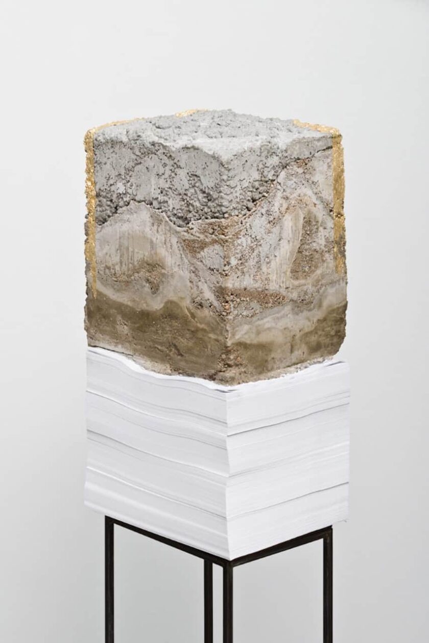 Un ossimoro artistico che vede contrapporsi il beton brut, materiale iconico di molti edifici, medium largamente impiegato nell’arte contemporanea già dagli anni sessanta e settanta del secolo scorso, che è simbolo dell’atto del costruire che si compie per stadi, distinguibili nella stratificazione della materia, e la carta, leggera e instabile, che incarna la vulnerabilità e la temporaneità delle costruzioni dell’uomo.
