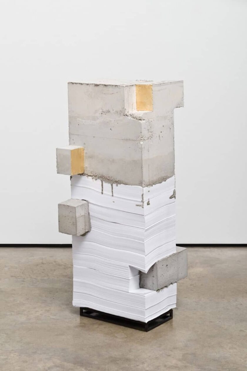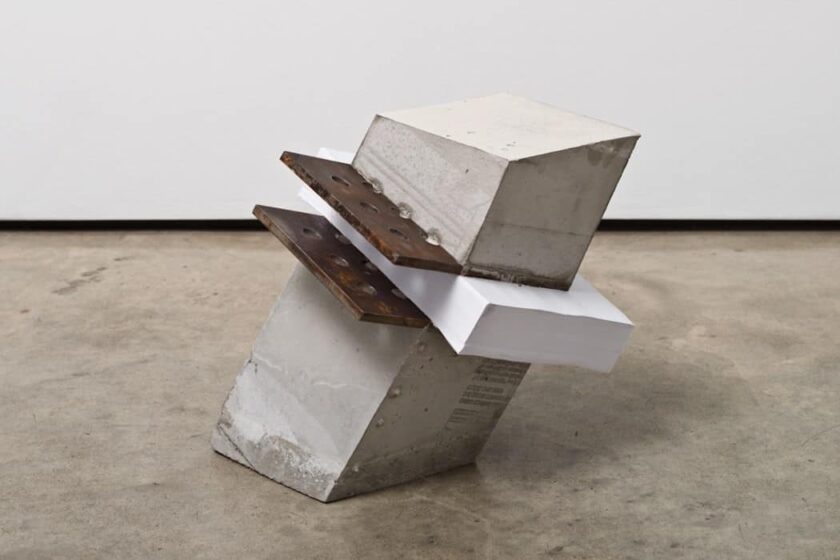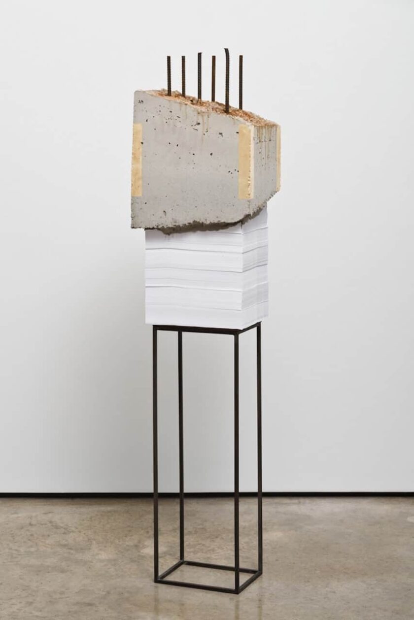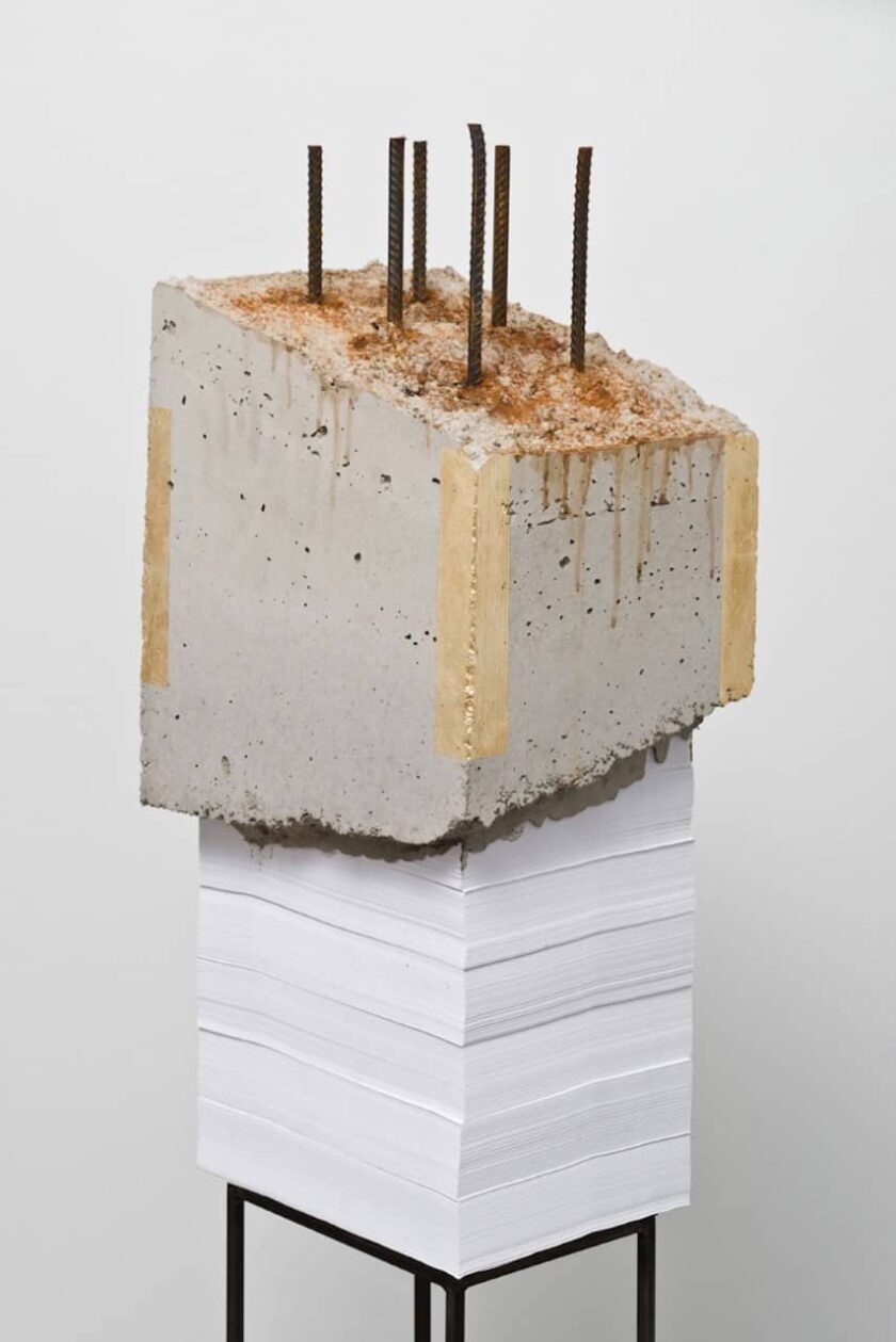 Sono giustapposizioni ambigue di materiali eterocliti, monoliti di calcestruzzo, metallo e pile di fogli, le sculture White Lies di Lucas Simões.