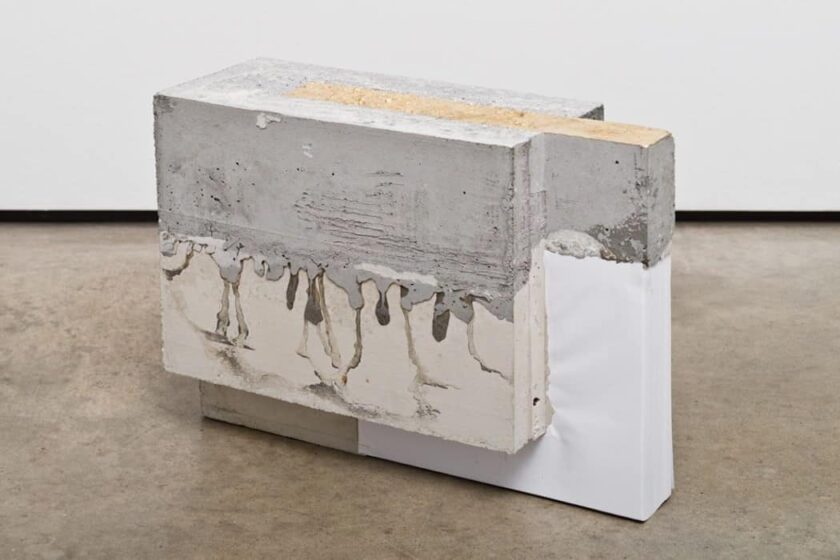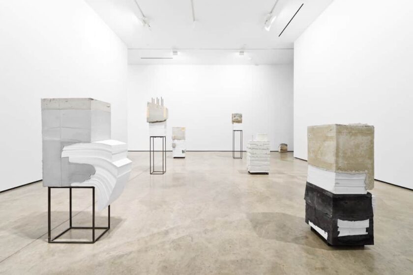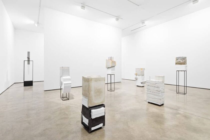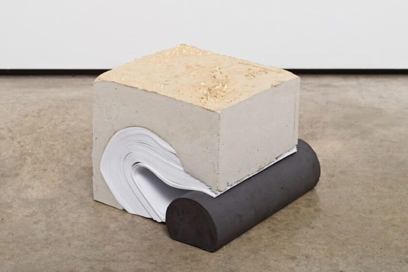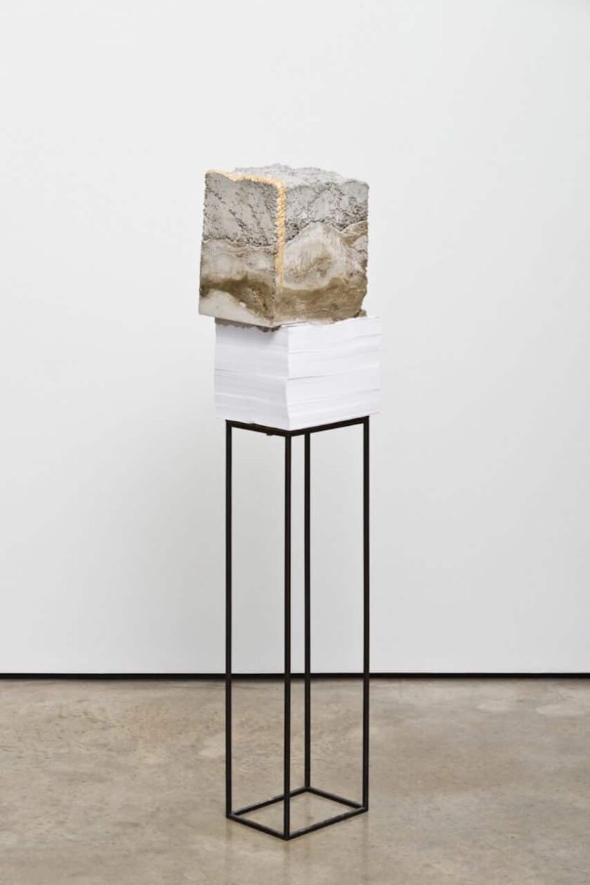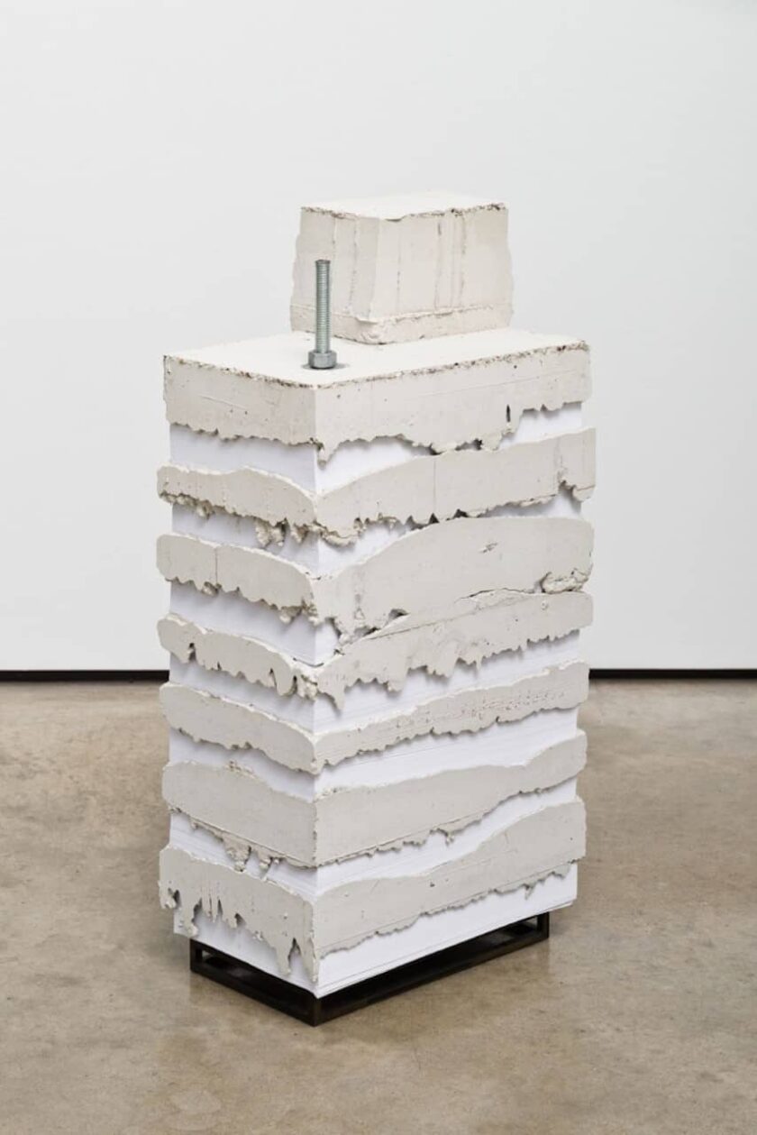 Sono giustapposizioni ambigue di materiali eterocliti, monoliti di calcestruzzo, metallo e pile di fogli, le sculture White Lies di Lucas Simões.