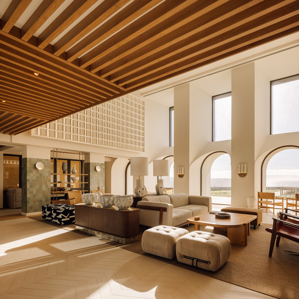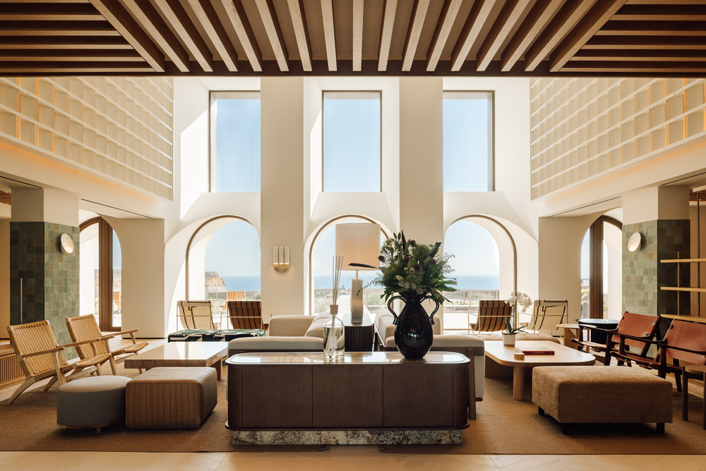 Una delle decisioni chiave è stata spostare l’ingresso principale verso il mare, creando uno spazio a doppia altezza che collega l’hotel all’incredibile panorama marino. Gli archi dell’edificio sono stati restaurati, aggiungendo proporzione, texture e profondità, mentre le finestre sono diventate distintive scatole metalliche sporgenti, diventando un elemento iconico.