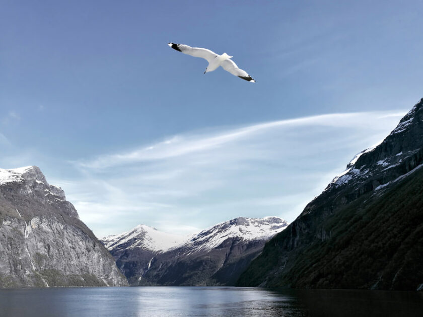 Dall’antico molo vichingo di Hellesylt, un battello conduce lungo i 20 km del sinuoso Geirangerfjord, nelle cui acque verde smeraldo si riversano quelle di scroscianti cascate – le Sette Sorelle, il Pretendente, il Velo della Sposa – e le cui scogliere si ergono maestose e punteggiate di vecchie fattorie abbandonate. Il volo dei gabbiani fa da cornice a un’emozione che è già memoria.