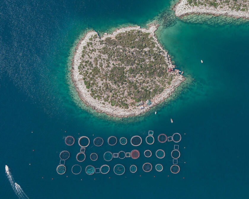 Il risultato di queste sue fotografie è un mix tra sfumature di blu del mare della Grecia e i pattern spontanei che nascono dai recinti e dagli schemi di allevamenti intensivi delle industri ittiche. Un punto di vista davvero suggestivo.