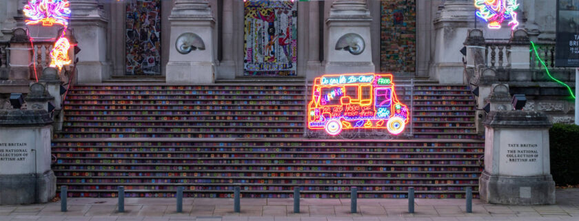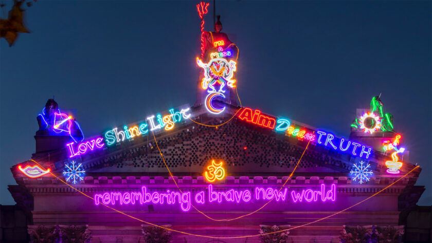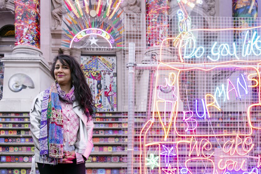 Un trionfo di colori e luci al neon, un immaginario bollywoodiano e il richiamo alla mitologia Hindu. Sono questi i protagonisti della nuova installazione della Tate Britain di Londra, elementi che stanno facendo risplendere lo storico museo nonostante la chiusura al pubblico per via dell’emergenza sanitaria.